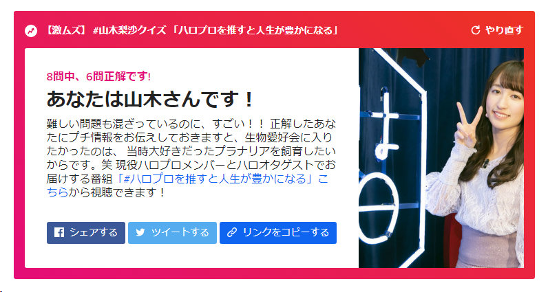 そうです、私が山木さんです 公開済み: 2019年3月15日更新: 2019年3月15日作成者: yamatamaカテゴリー: BLOG 山木さんクイズで二問も間違ってしまったけど、私は山木さんです。 https://www.buzzfeed.com/jp/keiyanakahara/yamakirisa-quiz?utm_source=dynamic&utm_campaign=bfsharecopy&bfsource=bfocompareoff&quiz_result=122387572_365278409#122387572 やなみんの卒コン 育苗する日々 関連記事 上野アメ横 永谷園のお茶漬けはたぶん本来の「お茶漬け」とは違うカテゴリーの食べ物なんだけど、あれがお茶漬けのデファクトスタンダードになってしまった感があり、もはや本来のお茶漬けがマイノリティになっているのではないかと思う今日この頃。 […] 頭がぐるぐる忙しくて、車輪の下 ちょっとここしばらく死ぬほど忙しくて死にかけていました。 仕事がもうパンク寸前で、その間に資格試験の勉強して受験して・・・でボロボロでまた全然マンガも描けなくて・・・。 だいぶ精神的にきつくなって、空いた時間はエルフェン […] 宮本佳林卒業 実のところこれほど驚きがない卒業発表も今までなかったというのが個人的な感想。 もうだいぶ前からブログの感じがゆるーい感じになっていたし、ソロもやりだしたし2年くらい前の鬼気迫る感じで歌っていた感じでもなくなっていたのでJ […]